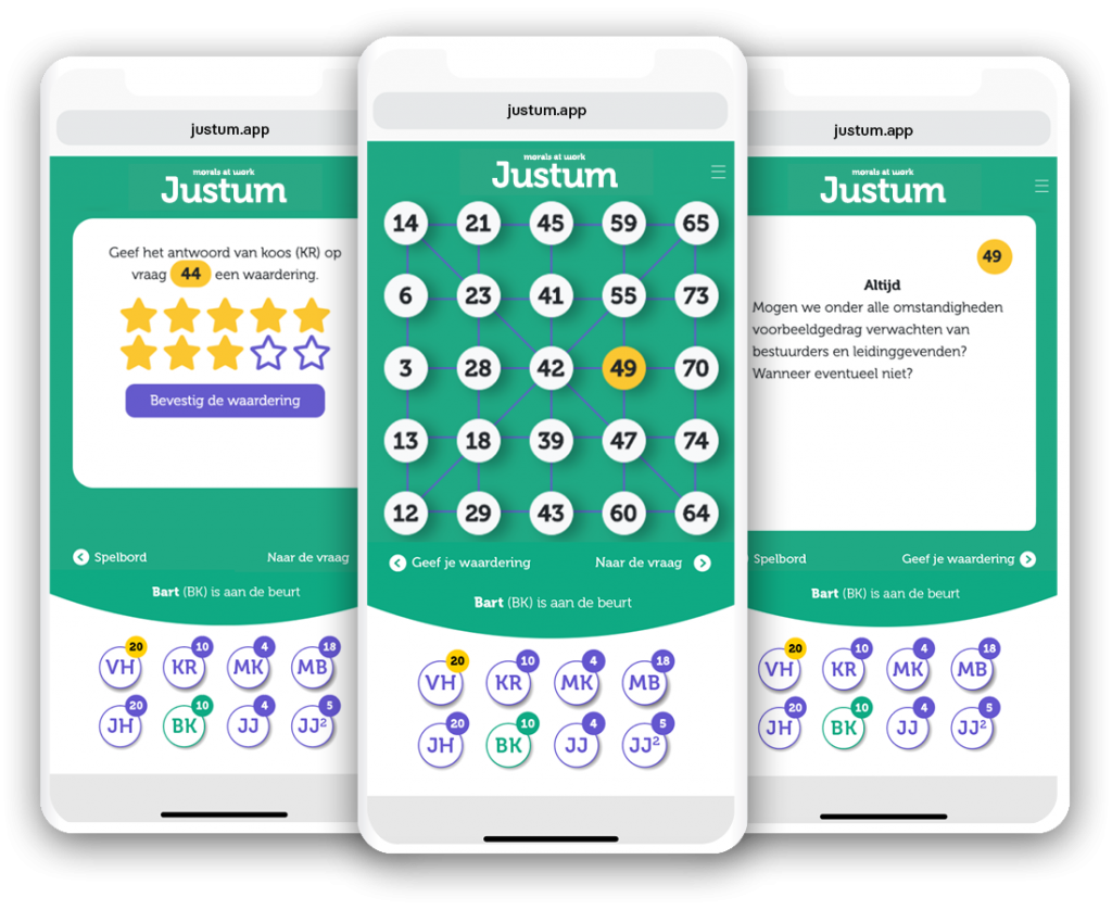 Justum is een online spel dat dilemma’s gebruikt om met elkaar in gesprek te gaan over lastige kwesties op het werk. Dat kunnen integriteitskwesties zijn, of zaken die de ontwikkelingen in je werk remmen. Soms gaat het over teamsamenwerking en leiderschap, dan weer over belangenverstrengeling, of ongewenste omgangsvormen en uitsluiting. Alles waar je last van kunt hebben op je werk komt aan bod.
